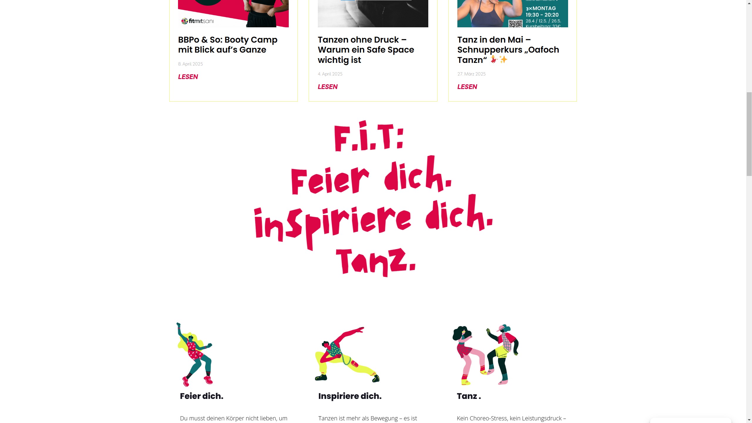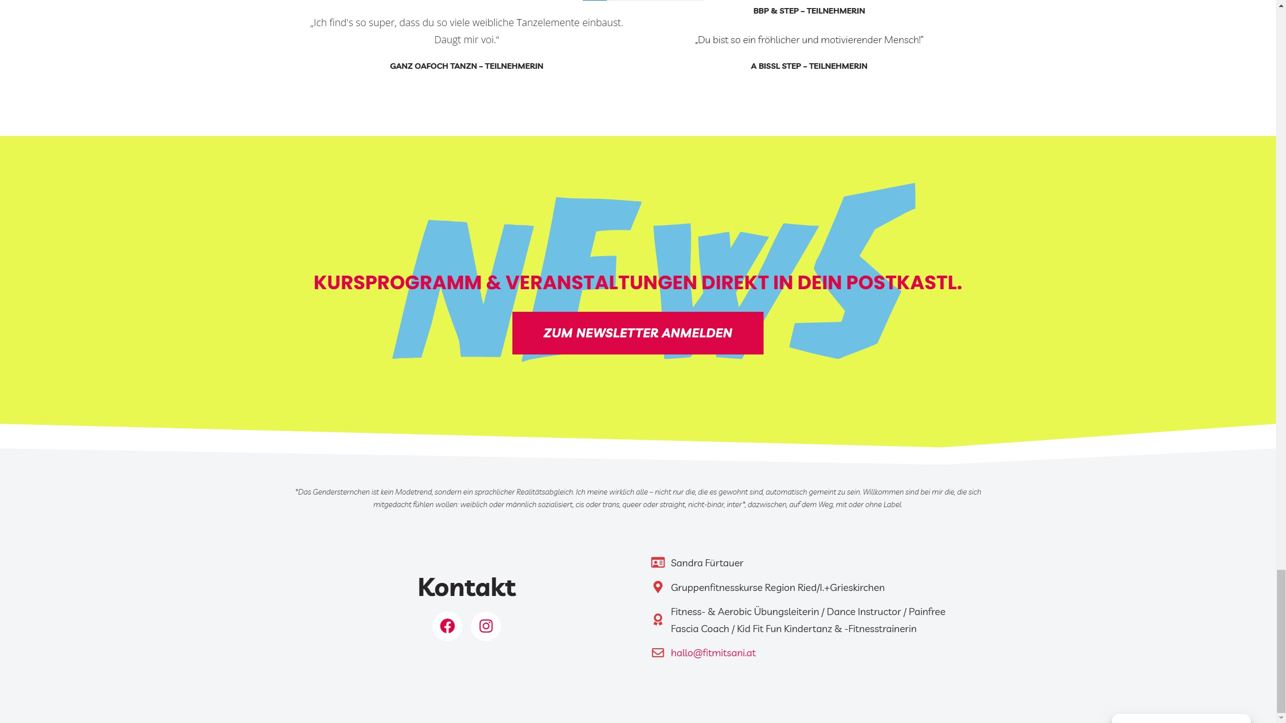 Die Website meiner Gruppenfitness Marke fitmitsani soll interessierten Personen einen Vorgeschmack geben, was sie in meinen Kursen erwarten können. Die direkte Buchung via Website verringert meinen administrativen Aufwand, und über den integrierten Newsletter kann ich Teilnehmer*innen unkompliziert informieren, wenn es etwas zu erzählen gibt.